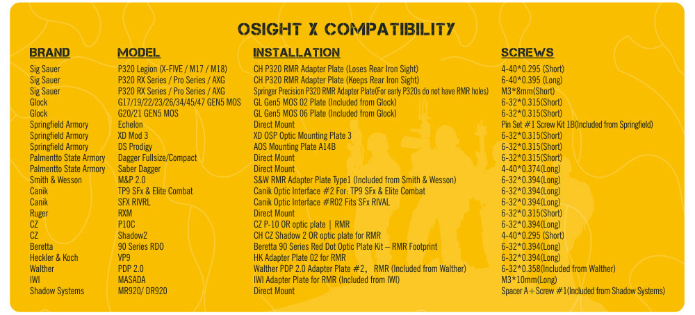 • Glock - G17/19/22/23/26/34/45/47 GEN 5 MOS