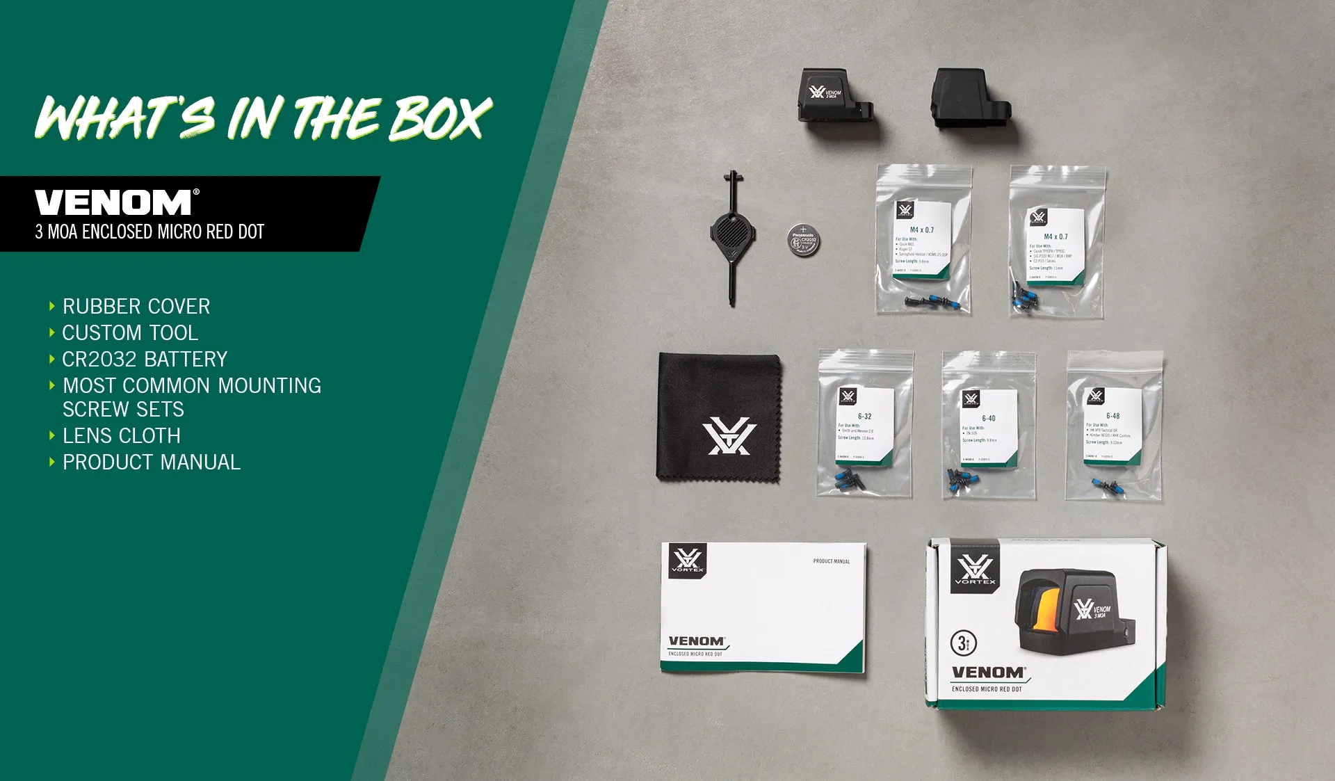 כוונת סגורה (Enclosed Solar Micro Red Dot) Venom מבית Vortex, חיתוך DPP (DeltaPoint® Pro) - מותאמת לאקדחים ושוטגאנים, עם טכנולוגיה מתקדמת, זמן סוללה ארוך במיוחד ועמידות גבוהה – הבחירה המושלמת לירי מקצועי ומדויק.